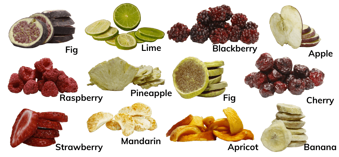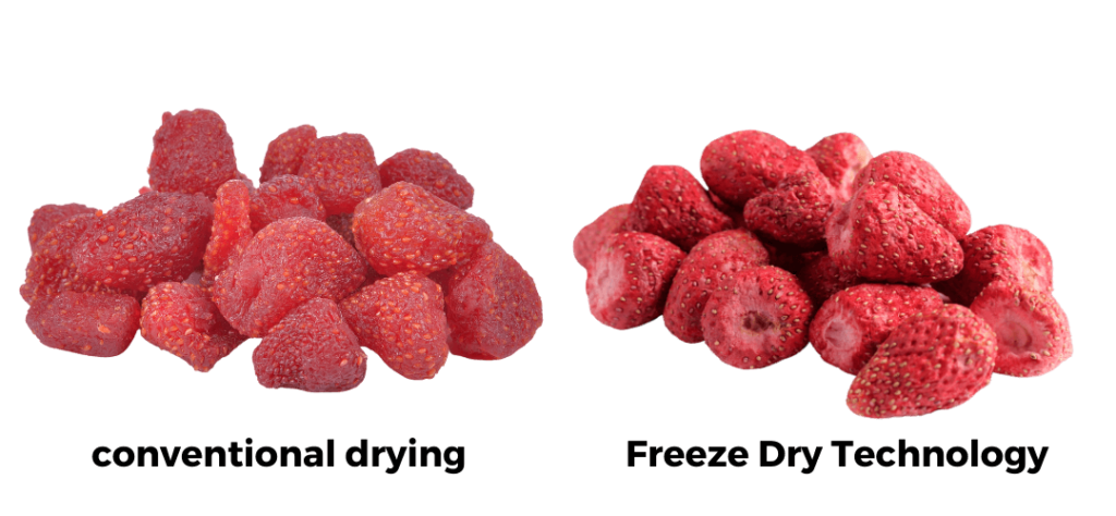 You can see the difference between dried and freeze dried fruit. Dried fruits become smaller as they lose their color. Freeze-dried fruits not only preserve their original size, but also maintain aroma and nutritional value at a higher rate.